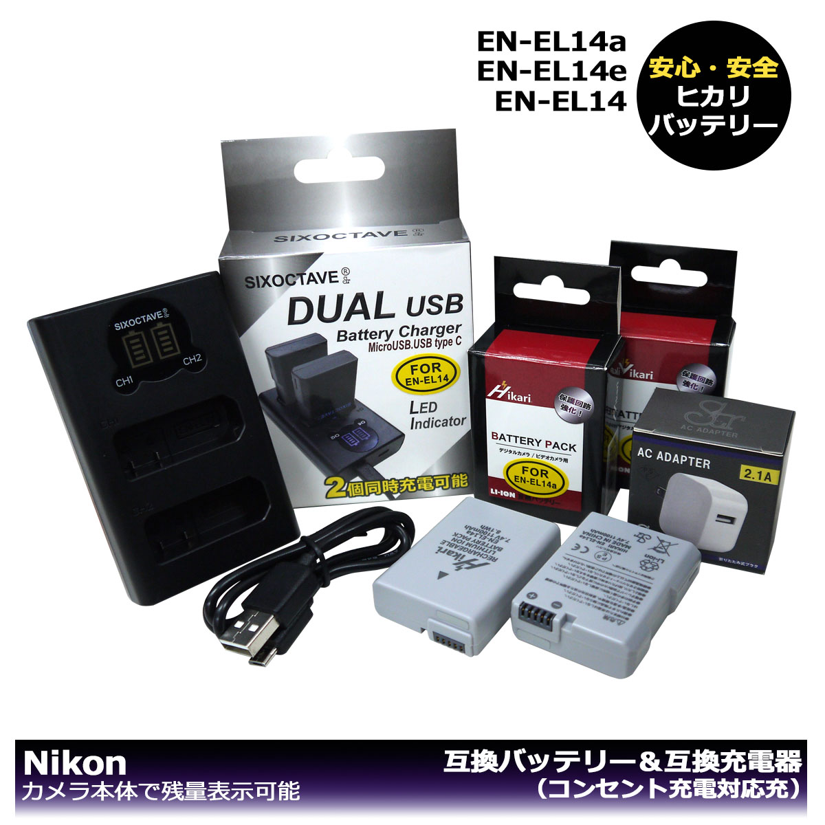 (大容量シリーズ)EN-EL14 / EN-EL14a / EN-EL14e 商品内容 互換バッテリー 2個 互換充電器(USB充電式) 1個※2個同時充電可能 コンセント充電用 ACアダプター 1個 規格 【バッテリー】 形式:リチウムイオン 電圧:7.4V 容量:1100mAh 寸法 約37.7×51.9×14.0mm 質量:約48g 【充電器】 入力:DC 5V ポート:Mircro usb x 1 Usb type c x1 出力:バッテリー1個 DC 8.4V 700mA バッテリー2個 DC 8.4V 500mA 対応機種 COOLPIX P7000 COOLPIX P7100 COOLPIX P7700 COOLPIX P7800 COOLPIX P8000 D3100 D3200 D3300 D3400 D3500 D5100 D5200 D5300 D5500 D5600 Df 互換バッテリー:EN-EL14 / EN-EL14a / EN-EL14e 対応充電器:EN-EL14 / MH-24 / MH-24a 仕様 【バッテリー】 ●大容量シリーズの互換バッテリー! ●最新ICチップ搭載 ●カメラ本体に残量表示可能。 ●純正充電器でも充電可能 ●PSEマーク(電気用品安全法)獲得製品。 ●CEマーク(欧州連合安全規制)獲得製品。 ●端子保護用のキャップ付き! 【充電器】 ●USB端子がある機器に接続し、どこでも充電可能 ●LCD充電量表示機能搭載。 ●2個同時に充電も可能。(1個でも充電可能) ●USB端子がある機器に接続し、どこでも充電可能。 (Multi USBコード付属) ●認証:CEマーク(欧州連合安全規制)取得製品。 ●純正&互換バッテリーも充電可能。 ●コンセント充電用ACアダプターセット ☆本製品には過電流保護、過充電防止、過放電防止の保護回路が内蔵。 保証:6ヶ月(PL保険(生産物賠償責任保険)加入済み。 ご購入日より6ヶ月の安心保証付き! 届出事業者名:株式会社ヒカリ PSマークの種類:PSE