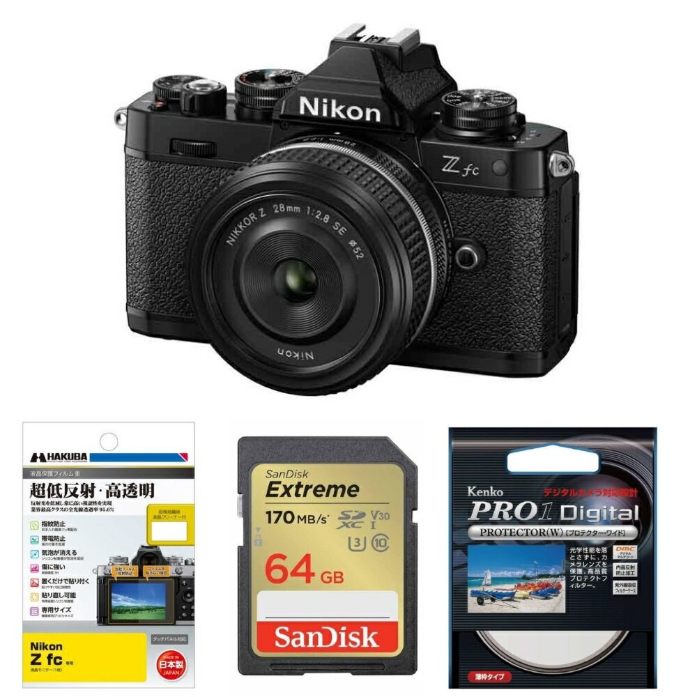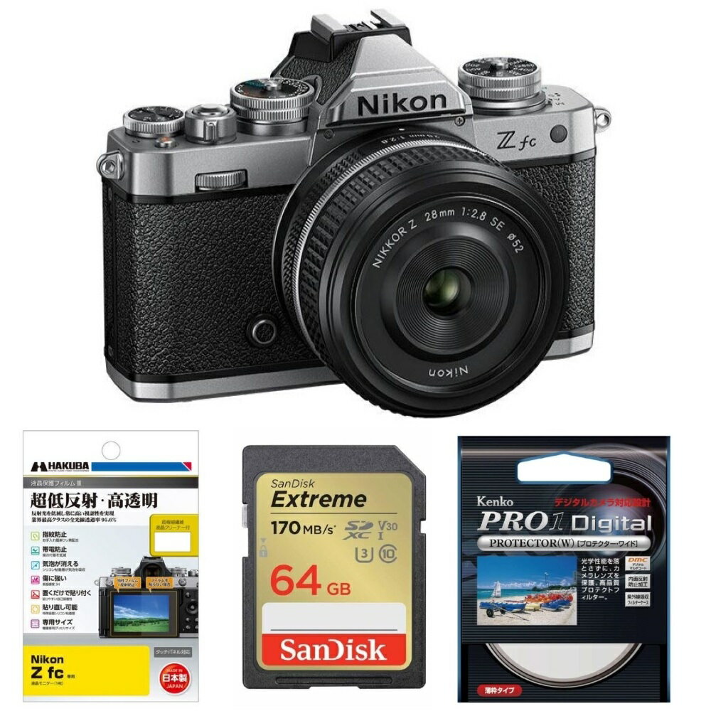 【ご購入対象期間】2026年1月13日迄※詳細はメーカーHPをご確認ください。 【お買い得セット内容】 ●Nikon ニコン ミラーレス一眼カメラ Z fc 28mm f/2.8 Special Edition キット ×1台 商品ページはコチラ ●ハクバ Nikon Zfc専用 液晶保護フィルム III DGF3-NZFC ×1枚 商品ページはコチラ ●サンディスク Extreme SDXC UHS-I カード 64GB SDSDXV2-064G-GNCIN 【海外パッケージ】 ×1枚 商品ページはコチラ ●ケンコー 52mm PRO1D プロテクター(W) レンズ保護フィルター ×1枚 商品ページはコチラ この商品の特徴 ●ミラーレスとニコンの伝統的なデザインの融合 ニコンFM2にインスパイアされた、精緻に作り込まれた外観デザインのZ fc。FM2に近い印象で再現したペンタプリズム部のデザインやボディーサイズ、黒とシルバーの色バランス、モニター背面にも施した革シボ風の表面加工が、フィルムカメラを思い起こさせます。またグリップレスのフラットなフォルムで、撮影したいときにはバッグからスムーズに取り出せます。 ●手応えのあるダイヤル操作も楽しい操作系 ボディーの天面にシャッタースピード、ISO感度、露出補正の3つのダイヤルと、F値を表示する小窓を搭載。一目で基本的なカメラ設定を視認できます。手応えのあるダイヤル操作は、一つ一つの設定を丁寧に調節してシャッターをきるという撮影スタイルを楽しませてくれます。 ●動画にも有効な瞳AF/動物AF搭載の高性能AF 像面位相差AFとコントラストAFを自動的に切り換えるハイブリッドAFで、とっさに現れた被写体もしっかりと捉えます。また、静止画にも動画にも有効な瞳AFと動物AFを搭載。友達や家族、ペット※が動いていても、その目にしっかりとピントを合わせることができます。 ※犬と猫にのみ対応。 ●高感度高画質 ISO 100-51200 最高常用ISO感度は51200※。高性能な撮像素子と、上位機種にも採用している画像処理エンジン EXPEED 6のノイズ低減により、静止画・動画どちらでも、細部や質感まで鮮明に描写できます。暗いシーンでも高感度に設定すればより高速のシャッタースピードを使用できるため、ブレの少ない写真が撮影できます。 ※204800相当まで増感可能。動画撮影時の常用最高ISO感度は25600。 ●クロップなしの4K UHD動画 4K UHD/30p動画をDXフォーマットベースで、クロップなしで撮影可能。バリアングル式画像モニターを正面に向けると自分撮りモードが起動し、瞳AFや被写体を追い続けるフルタイムAF(AF-F)を使って、高画質なVlog動画の撮影も容易に行えます。 【付属レンズ】 NIKKOR Z 28mm f/2.8(Special Edition) 主な仕様 有効画素数 2088万画素 撮影感度(ISO感度) 100〜51200(最大204800) 連写撮影 最高約11コマ/秒 バッテリー EN-EL25 記録メディア SD、SDHC、SDXCメモリーカード (SDHC、SDXCはUHS-I規格に対応) サイズ(W×H×D) 約(幅)134.5 x (高)93.5 x (奥)43.5mm 本体重量 約390g(本体のみ) 液晶サイズ バリアングル式3.0型TFT液晶モニター 約104万ドット