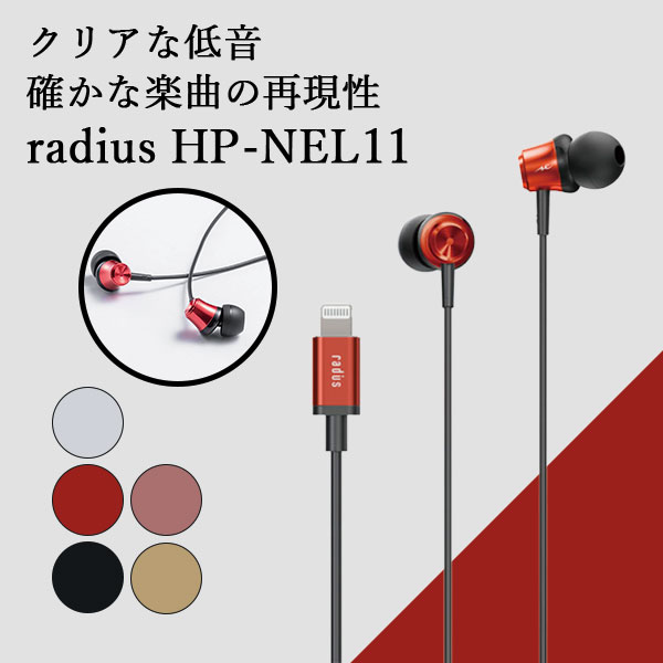 ラディウス HP-NEL11N Lightning直結 カナル型インナーイヤホン ゴールド発売日:2020年6月9日●iPhoneと有線接続で遅延なしLightningコネクタを使用するためワイヤレス接続と異なり音声の遅延がありません。音楽再生に限らず動画観賞やリズムゲームなどでの使用にも最適です。●クリアな楽曲再現カナルタイプならではの高い遮音性とコンパクトながらパワフルに駆動するドライバーユニットによりクリアな低音と確かな楽曲の再現性を実感できます。また、Lightning直結なのでデジタル音源を劣化させることなく高音質のまま取り出し、再生することが可能です。●音声をクリアに伝えるハンズフリー通話対応の多機能リモコン搭載小型リモコンを搭載し、楽曲の再生・停止/曲送り・曲戻し/早送り・早戻し/音量UP・音量DOWN/着信時の受話・終話といった操作が可能。音声通話の際に周囲のノイズ(雑音)を取り除き、自分の声をクリアに相手に伝えるノイズ低減機能を備えたマイク搭載でハンズフリー通話やSiriの操作も可能です。●Appleの正規ライセンス取得製品Apple社が定めた性能基準を満たしたMFiライセンス商品です。●5色のカラーラインアップシルバー、ブラック、ピンク、ゴールド、レッドの全5色。日常シーンに合わせて、お好きなカラーをお選びいただけます。【仕様】型式:ダイナミック型ドライバー:Φ10 mm出力音圧レベル:98±3dB伝送周波数帯域:20Hz〜24、000Hz対応ビット数 /サンプリングレート:最大 24bit/48kHzプラグ:Lightningコネクタケーブル長さ:約120cm(Y 型)タイプ 主な付属品 :イヤーピース(S、M、L)×各1セット、取扱説明書、保証書