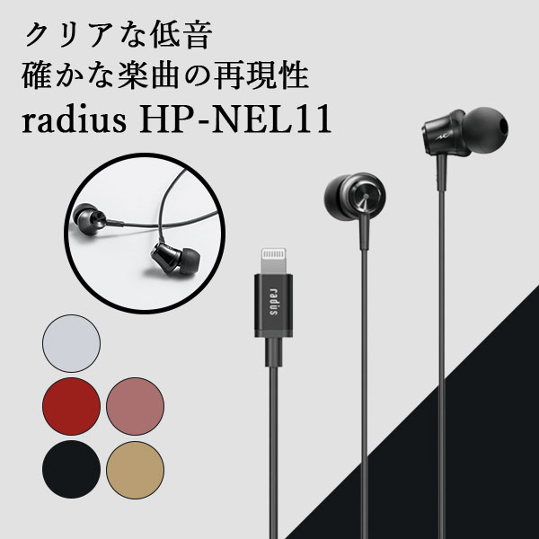 ラディウス HP-NEL11K Lightning直結 カナル型インナーイヤホン ブラック発売日:2020年6月9日●iPhoneと有線接続で遅延なしLightningコネクタを使用するためワイヤレス接続と異なり音声の遅延がありません。音楽再生に限らず動画観賞やリズムゲームなどでの使用にも最適です。●クリアな楽曲再現カナルタイプならではの高い遮音性とコンパクトながらパワフルに駆動するドライバーユニットによりクリアな低音と確かな楽曲の再現性を実感できます。また、Lightning直結なのでデジタル音源を劣化させることなく高音質のまま取り出し、再生することが可能です。●音声をクリアに伝えるハンズフリー通話対応の多機能リモコン搭載小型リモコンを搭載し、楽曲の再生・停止/曲送り・曲戻し/早送り・早戻し/音量UP・音量DOWN/着信時の受話・終話といった操作が可能。音声通話の際に周囲のノイズ(雑音)を取り除き、自分の声をクリアに相手に伝えるノイズ低減機能を備えたマイク搭載でハンズフリー通話やSiriの操作も可能です。●Appleの正規ライセンス取得製品Apple社が定めた性能基準を満たしたMFiライセンス商品です。●5色のカラーラインアップシルバー、ブラック、ピンク、ゴールド、レッドの全5色。日常シーンに合わせて、お好きなカラーをお選びいただけます。【仕様】型式:ダイナミック型ドライバー:Φ10 mm出力音圧レベル:98±3dB伝送周波数帯域:20Hz〜24、000Hz対応ビット数 /サンプリングレート:最大 24bit/48kHzプラグ:Lightningコネクタケーブル長さ:約120cm(Y 型)タイプ 主な付属品 :イヤーピース(S、M、L)×各1セット、取扱説明書、保証書