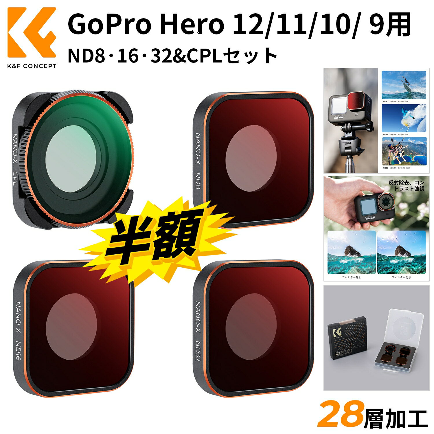 Max10%OFF配布中!! K&F Concept GoPro Hero 12/Hero 11/Hero 10/Hero 9 Black用フィルターセット ND8+ND16+ND32+CPL 日本製AGC光学ガラス 28層ナノコーティング 撥水撥油キズ防止