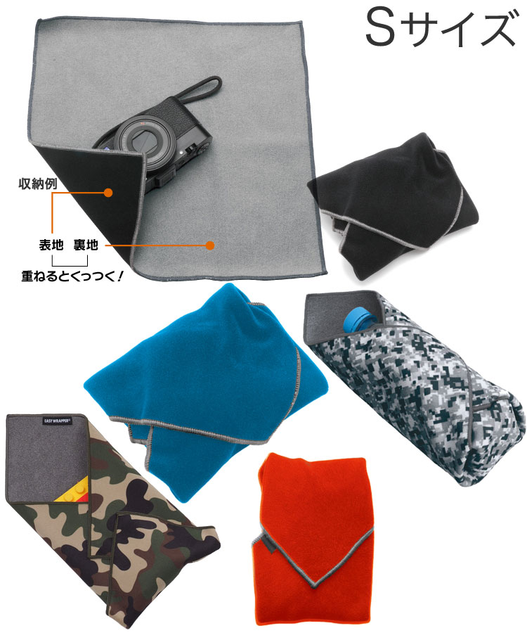 ・イージーラッパーは、巻くだけでくっつく新世代の風呂敷風、機材保護ラップ。 ・裏地と表地が触れるとくっつくので、大切なものをくるくるっと包んでいくだけでぴったりくっつき、はがす時もいやな音がしない。 ・表地と裏地ならどこでもくっつくので、持ち運んでもバッグの中でもばらけず、軽く持ち上げると簡単にはがすことが可能。 ・水洗いOK! Sサイズ:280×280mm カラー:ブラック/ブラック/レッド/ブルー/モノクロ迷彩/グリーン迷彩(カモフラージュ)/迷彩 時計・コンデジ・キーホルダー・アクセサリーなど、小さくて大切なものを包むのに最適! 素材:ポリエステル100% *防水仕様ではありません。 *重ねた部分を持ち手にしてぶら下げないでください。中身が落下する恐れがあります。 *この商品はメール便で発送します。 *宅配便をご希望の際は『当店への連絡事項欄』にお書きください。その際は別途宅配便送料がかかります。