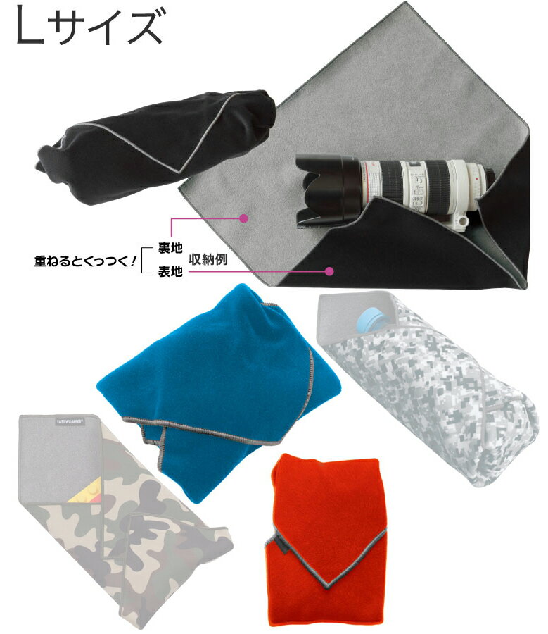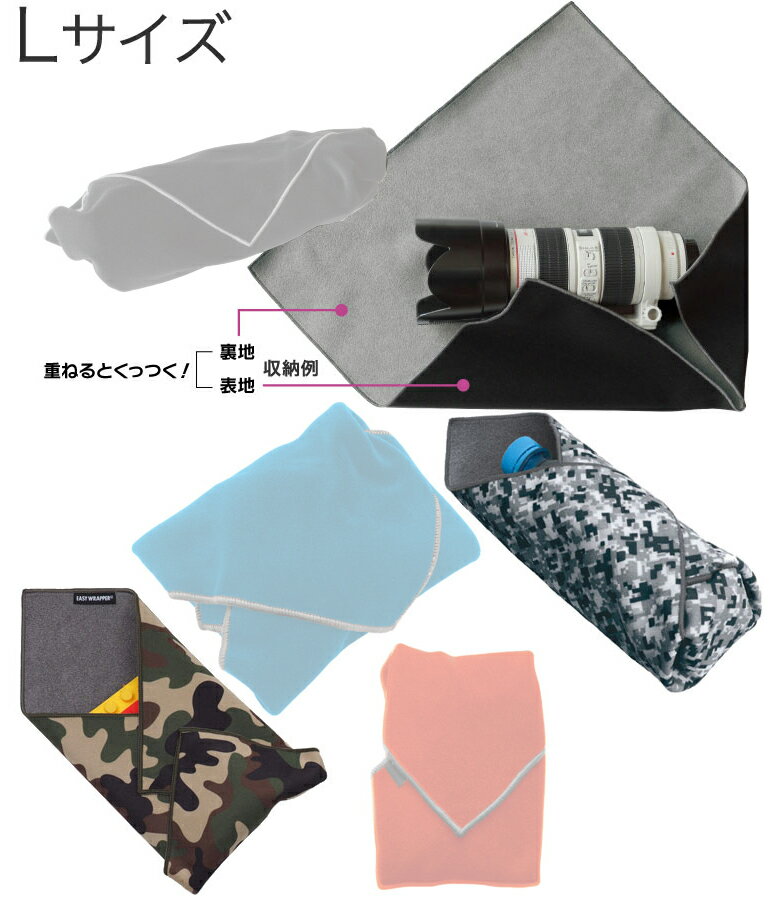 ・イージーラッパーは、巻くだけでくっつく新世代の風呂敷風、機材保護ラップ。 ・裏地と表地が触れるとくっつくので、大切なものをくるくるっと包んでいくだけでぴったりくっつき、はがす時もいやな音がしない。 ・表地と裏地ならどこでもくっつくので、持ち運んでもバッグの中でもばらけず、軽く持ち上げると簡単にはがすことが可能。 ・水洗いOK! Lサイズ:470×470mm カラー:ブラック/ブラック/レッド/ブルー/モノクロ迷彩/グリーン迷彩(カモフラージュ)/さくら迷彩/迷彩 一眼レフカメラ・中型レンズ・三脚アクセサリーなど、大きさがあり大切なものを包むのに最適!重いものを包んでもばらけません。 素材:ポリエステル100% *防水仕様ではありません。 *重ねた部分を持ち手にしてぶら下げないでください。中身が落下する恐れがあります。 *この商品はメール便で発送します。 *宅配便をご希望の際は『当店への連絡事項欄』にお書きください。その際は別途宅配便送料がかかります。