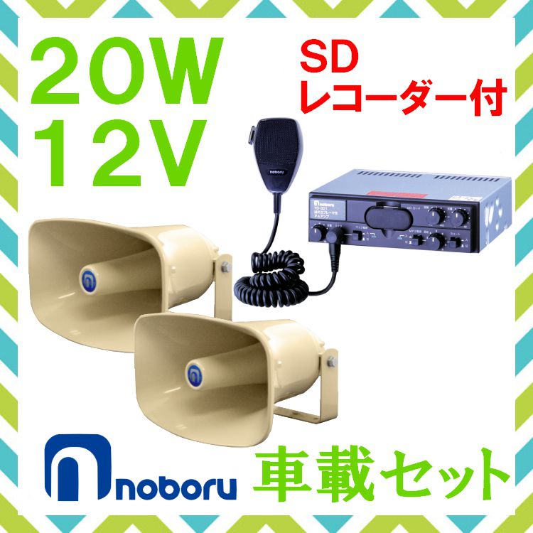 選挙車・宣伝車・広報車に最適のセットです!【セット内容】・ノボル電機 20W ホーンスピーカー NP-520 ×2 (定格入力:20W)・ノボル電機 40W SD付アンプ 12V用 YD-341B ×1(定格出力:40W、インピーダンス:4Ω・8Ω)・ハンドタイプマイクロホン(付属マイク)・スピーカーコードは別売です。※SDカードは付属しておりませんので、別途ご用意下さい。※北海道・沖縄・離島地域は、別途送料をご負担頂きます。