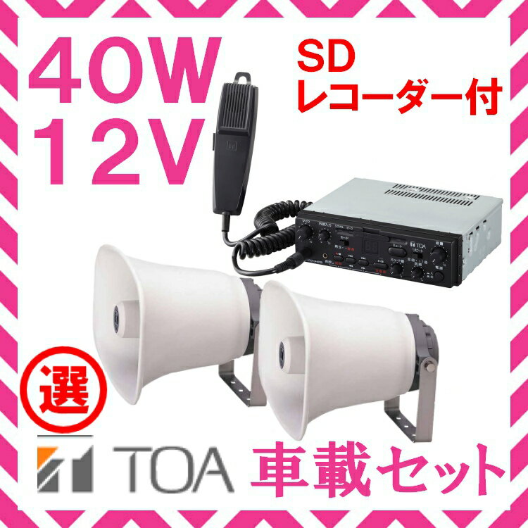 選挙車・宣伝車・広報車に最適のセットです!【セット内容】・TOA 30W ホーンスピーカー SC-730A ×2(定格入力:30W、インピーダンス:16Ω)・TOA 40W SD付アンプ 12V用 CA-407SD ×1(定格出力:40W、インピーダンス:4Ω/8Ω)・ハンドタイプマイクロホン(付属マイク)・スピーカーコードは別売です。※北海道・沖縄・離島地域は、別途送料をご負担頂きます。