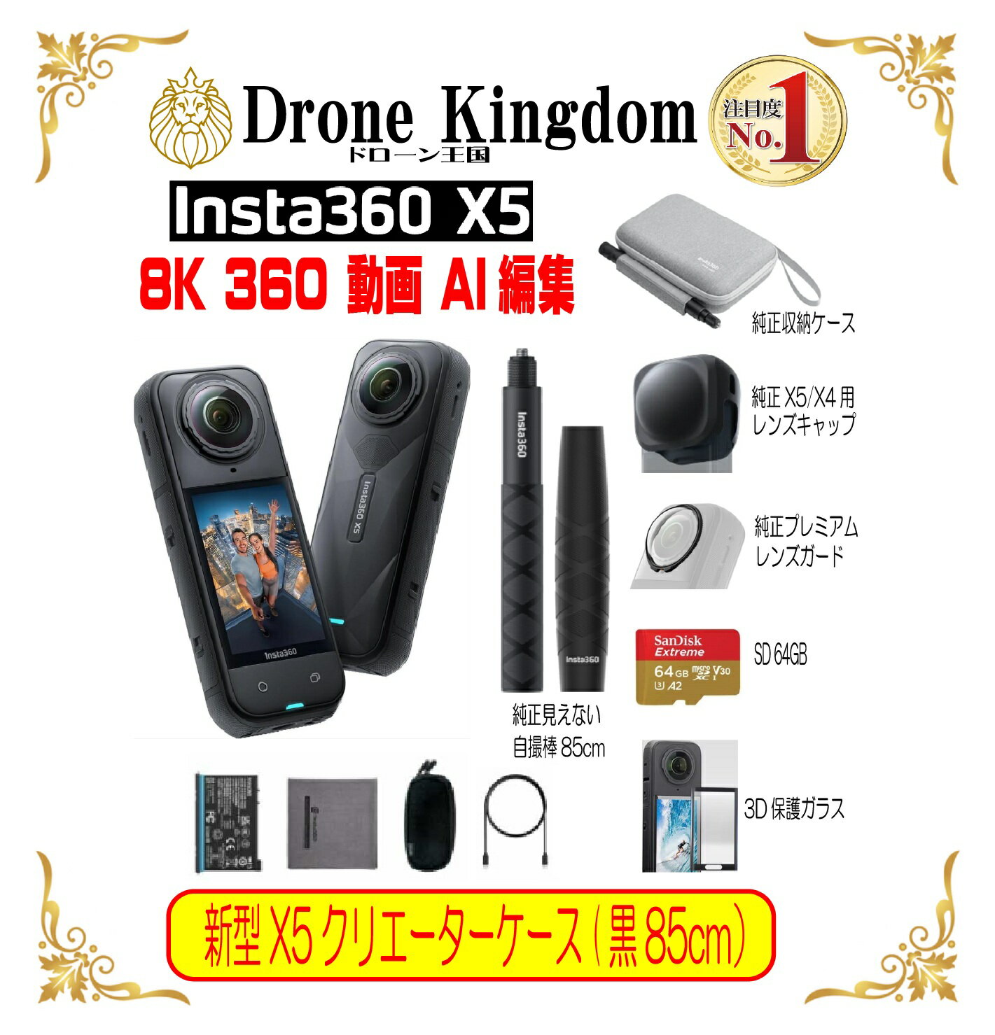 【数量限定!即納!】新型Insta360 X5クリエーター本体+新自撮り棒85cmグリップ+純正X5/X4キャップ+純正プレミレンズ+メモリ64GB+3D保護ガラス+純正収納ケース