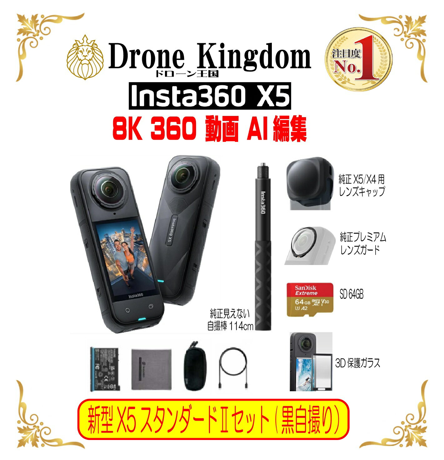 【数量限定!即納!】新型Insta360 X5 STD2本体+黒自撮り棒114cm+純正X5/X4キャップ+純正プレミレンズ+メモリ64GB+3D保護ガラス
