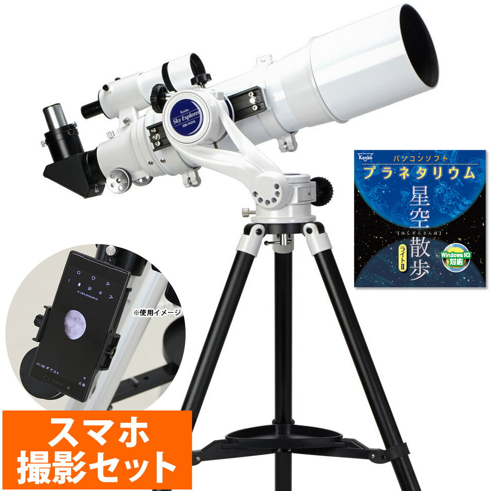 天体望遠鏡 初心者用 小学生 子供 スカイエクスプローラー SE-AZ5 三脚付き 102鏡筒セット ケンコー おすすめ Sky Explorer ホワイト Kenko 天体観測 月 星団 星雲 プレゼント商品番号:KE-AS-100フリーストップ式経緯台 SE-AZ5に、SE102鏡筒をセット。天体望遠鏡を初めて購入の方から、ワンランク上の天文ライフを楽しみたい方まで、幅広いお客様のニーズに対応した天体望遠鏡です。口径102mmの屈折式望遠鏡「SE102」を搭載。取り扱いやすいコンパクトな鏡筒です。スマホ撮影用アダプター付き!【スマホ横幅サイズ:55~98mmまで対応】フリーストップ式 経緯台 三脚付き スカイエクスプローラー SE-AZ5 ケンコー 天体望遠鏡 おすすめ Sky Explorer Kenko ホワイト 天体観測 月 星団 星雲 プレゼント商品番号:KE-AS-102手を離したところで止まる、フリーストップ式の経緯台。三脚付き。SE-AZ5 はフリーストップ式の経緯台です。取り付けた鏡筒を手で動かし、離したところで止まる仕様になっていますので、直感的に操作することが可能です。初めて天体望遠鏡を使う方や、気軽に星を楽しみたい方にもおすすめです。天体望遠鏡 スマホ 撮影 初心者用 天体望遠鏡セット SKY WALKER スカイウォーカー 小学生 子供 携帯 SW-50A 天体/地上両用 屈折式 天体観測 自然観察 ガイドブック付き ケンコー Kenko商品番号:KE-AS-085SKY WALKER SW-0 が、SKY WALKER SW-50Aとして、リニューアル(安定した三脚と付属品もボリュームUPして新登場)! 天体観測と自然観察、スマホ撮影もできる望遠鏡。スマートフォンアダプターも標準装備されていますので、スマートフォンを取りつけて写真や動画も撮影することができ、見た感動を映像として残すことができます。4961607002667 ls@KE-AS-101天体望遠鏡 初心者用 小学生 子供 スカイエクスプローラー SE-AZ5 三脚付き 120鏡筒セット ケンコー おすすめ Sky Explorer ホワイト Kenko 天体観測 月 星団 星雲 プレゼントSE-AZ5フリーストップ式経緯台 SE-AZ5に、SE120鏡筒をセット。天体望遠鏡を初めて購入の方から、ワンランク上の天文ライフを楽しみたい方まで、幅広いお客様のニーズに対応した天体望遠鏡です。鏡筒は口径120mmの屈折式望遠鏡「SE120」を搭載。スマホ撮影用アダプター付き!【スマホ横幅サイズ:55~98mmまで対応】フリーストップ式経緯台 SE-AZ5に、SE120鏡筒をセット天体望遠鏡を初めて購入の方から、ワンランク上の天文ライフを楽しみたい方まで、幅広いお客様のニーズに対応した天体望遠鏡です。経緯台はフリーストップ式の「SE-AZ5」。鏡筒を手で動かし、離したところで止まる仕様になっていますので、直感的に操作することが可能です。初めて天体望遠鏡を使う方や、気軽に星を楽しみたい方にもおすすめです。鏡筒は口径120mmの屈折式望遠鏡「SE120」を搭載。フリーストップ式鏡筒を水平・垂直方向にて手で動かし、見たい位置で手を離せばそこで止まってくれますので簡単に鏡筒を対象物に向けることが可能です。微動ハンドル付き微動ハンドルがついていますので、より細かな位置の設定が可能となります。簡単組み立て架台と三脚は、ネジ1本で取り付けが可能。簡単に組み立てができますので、見たいときにさっと出して観察することができます。アリ溝式鏡筒の取り付けは、45mm幅のアリ溝形式。簡単に鏡筒の取り付け、取り外しが可能です。アルミ製伸縮式三脚標準装備軽量で持ち運びに便利なアルミ三脚が標準装備。アクセサリートレイ付きですのでしっかりと固定され、安定して観測できるでしょう。望遠鏡、顕微鏡、双眼鏡で使用できます! 問い合わせ品番:SE-AZ5天体望遠鏡 初心者用 小学生 子供 スカイエクスプローラー SE-AZ5 三脚付き 120鏡筒セット ケンコー おすすめ Sky Explorer ホワイト Kenko 天体観測 月 星団 星雲 プレゼントスペック鏡筒の仕様天体望遠鏡の種類屈折式対物レンズ120mm焦点距離600mm極限等級 12.17等星F値5集光力293.88倍分解能0.97秒ファインダー9倍 50mm質量4.9kg ※フード含むサイズ(外径×長さ)143×660mm ※突起部を除く架台の仕様架台部経緯台式ウォームホイル数90枚(全周微動)アリ溝幅45mm耐荷重5kg高度範囲-50~90°高さ22cm ※突起部を除く質量 2.3kg三脚の仕様高さ64~122cm質量1.8kg三脚+マウント質量4.1kgサイズ(外径×長さ) 860~1,340mm ※突起部を除く付属品9×50mmファインダー、アイピース(PL10mm・PL25mm)、星空散歩ライト2、スマホアダプター【スマホ横幅サイズ:55~98mmまで対応】 ケンコー ※仕様及び外観は改善のため、予告なく変更することがあります。鏡筒は口径120mmの屈折式望遠鏡「SE120」を搭載 スマホ撮影用アダプター付き 星空 アウトドア