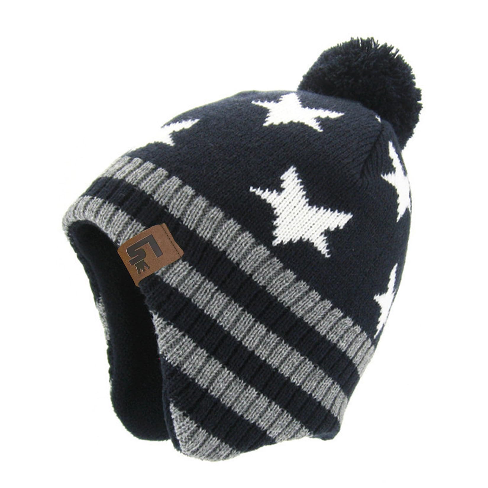 【送料無料】[LittleSpring] 耳あて ニット 帽子 ポンポン付き 防寒 防風 あったか ニットキャップ キッズ用ハット ニット帽 子供服 ジュニア ボーイズ 色:ネイビー-ボーダー、サイズ:S