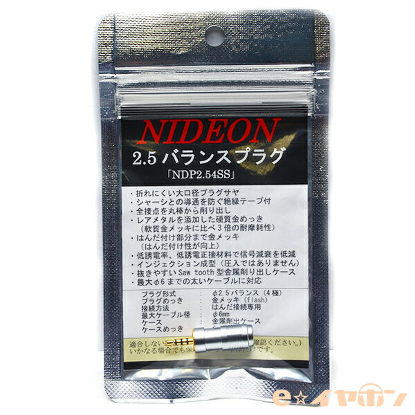 ◎特徴■NIDEON NDP2.54SS 2.5φバランスプラグ(4極)安定した接続を追及した2.5バランスプラグ 日本人職人の技術を終結させて完成した2.5バランスプラグです。 本当の高品質は目に見えない部分にどれだけ手をかけたかで決まります。・全電極を削り出し製造 すべての電極を丸棒から削り出して製造しています。時間はかかりますが切削速度を下げて加工制度を上げるという手間のかかる方法をとっています。加えて電極が回転するのを防ぐ目的で、回転止めを設けています。目に見えないところまでお客様の使い勝手を考えた構造です。・高精度組み立て技術 コストを下げるために成型した絶縁樹脂に各電極を挿入する方法を取る方法もありますが、弊社では電極の抜けを防止する目的と電極間を均一にするために熟練職人がすべての電極を新円になるように手で配置し、固定した後に気泡の巻き込み、偏りがないように樹脂を流し込み成型する手作業による組立てを行っています。製造時にはプラグを切断し電極の位置、樹脂の充填状態を確認してから最適条件であることを確認した後に成型を行っています。・低誘電率、低誘電正接材料で減衰低減 誘電率、誘電正接が大きい材料では高周波数になるに従い信号の減衰が大きくなります。本プラグは低誘電率、低誘電正接材料を使い高周波まで減衰の少ないバランスプラグにしました。・レアメタルを添加した摩擦に強い硬質金めっき レアメタルを使用して耐摩耗性を軟質金の3倍に向上させた金めっきです。摩擦により金めっきが剥げるのを防止しています。・抜き差ししやすいSaw tooth型金属削り出しケース サヤの外周に指に引っかかりやすいSaw tooth型の切れ込みを入れました。抜き差しのしやすさを大幅に改善しました。・接続安定性を持たせた大口径プラグ 2.5プラグは細い分、3.5プラグに比べてジャックとの接触面積が小さく横からの力に弱い構造です。プラグに余計な力がかかった場合、音が途切れたり最悪の場合プラグが折れる可能性があります。本プラグはプラグの径を10mmと大口径にし、横方向からの力をプラグではなく、プレイヤー本体に分散させる構造にしています。加工精度、組み立て精度と合わせて接続性の向上を図っています。・最大φ6までの太いケーブルに対応太いケーブルにも使用できるように最大直径6mmまでのケーブルに対応できるようにしました。 ・絶縁シール付シャーシーとの接触で発生するノイズを防ぐ絶縁シールを付属しています。
