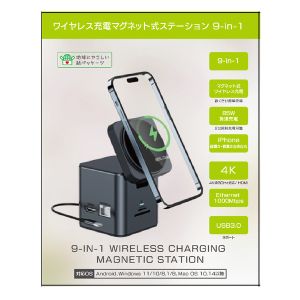※送料無料対象商品のみのご注文で送料無料になります。(沖縄・一部離島等は対象外となります)送料有料の商品と同時にご注文の場合は送料が発生いたします。ご了承ください。カラー ブラック本体素材 アルミ合金+ABS本体サイズ 約64.5×64.5×79mm本体重量 約305gポート数 8入力 (Type-C)5V3A/9V3A/12V3A/15V3A/20V5A、100Wmax.Airpods5Wmax.Wireless出力 15Wmax.Wireless入力対応機器 iPhone8以降、ワイヤレス充電対応スマホ機種、AirPods※マグネット式非対応機器は、平らに置いてご使用ください※充電は接続機器が仕様に対応している必要がございますiPhone充電部角度調整範囲 約80度対応OS Android、Windows11/10/8.1/8、MacOS10.14以降対応メディア SD&MicroSDカード:SD/SDHC/SDXC各容量最大速度規格UHS-I※UHS-以上の速度に対応しておりません※複数カードの同時使用はできませんホスト側インターフェース USB3.1Type-C5-20V(0〜4.5A)87W/PD3.0電源供給 バスパワー・セルフパワー(PD対応のACアダプター及びケーブル※別売を使用し、セルフパワーとして使用可能)動作確認LED デバイスに接続すると点灯推奨使用環境温度 5℃〜45℃保護回路 過電圧、過電流、過熱、短絡保護回路内蔵認証 CE、FCC、RoHSスマホケースを使用する場合、マグネット式充電対応のケースをご使用くださいマグネット部以外に傾けて節電させると過度な発熱の原因となりますのでご注意くださいACアダプターは付属しておりませんQC又はPD対応のACアダプター・充電ケーブルをご使用くださいご使用の機器へ給電前に本製品をACアダプターに接続してください磁気カード、磁気ストライプメディア、精密機械などを本製品に近づけないでください機器の電源が入らない、すぐ切れる場合は充電できない可能性がございます本製品を分解・改造・修理しないでください強い衝撃を加えたり、変形、落下させたりしないでください乳幼児が触れたり手の届くところに放置しないでください周囲温度5〜45℃の範囲内で使用してください直射日光の当たる場所や高温多湿、火のそばで使用、放置はしないでください