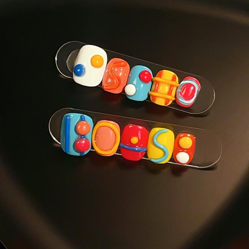 夏 ネイルステッカー 学生用 かわいい カラフル 立体 キャンディビーンズ デザイン 短め 手作り風 ドーパミン カラー 付け爪 フェイクネイル ピンク系 ピーチ グリーン ブルー イエロー 多色使い 簡単貼り付け 通学 日常使い 軽量 柔軟素材