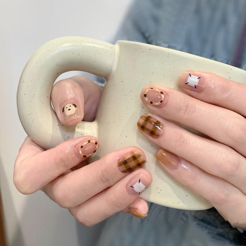 つけ爪 秋冬 手描き 小犬 カートゥーン ミルクティーブラウン かわいい ネイルアート ファッション 日常使い アクリル素材 軽量 伸縮性・スタイル: 復古・柄: 大理石・対象: 女性・サイズ展開: XS,S,M,L