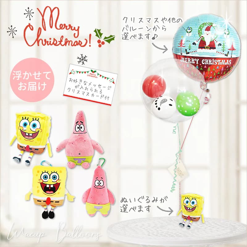 【注文について】 このバルーン電報はぬいぐるみが持つ1番上のバルーンをお選びいただけます。。 おまかせでサクッと注文! しっかり選びたい方は、こちら↓ 1.(スマホ)商品を『カゴに追加』し、 2.(スマホ、PC)『どのバルーンにする?』欄で、『自分で選ぶ(一覧から選択)』を選択し、 3.(スマホ、PC)ぬいぐるみを選べる場合は、ぬいぐるみを選択し、 4.一旦『カゴに追加』してください。 5.追加したら商品ページに戻るので、下の『選択バルーン一覧』の画像をクリックし、お好きなバルーンを『カゴに追加』してください。 スポンジボブ好きに贈りたい! クリスマス限定のバルーンギフト登場☆メリークリスマス! クリスマスのワクワクを詰め込んだ特別なバルーンセット。 お好きなバルーンを1個選んで、スポンジボブやパトリックのぬいぐるみと一緒にアレンジしてお届けします。 透明バルーンの中には、スノーマンや星柄のミニ風船が3個(黄緑、赤)入っており、クリスマス気分を一層引き立てます♪ ぬいぐるみは細部までこだわったつくりで、『スポンジ・ボブ』の世界観そのまま。 安定感があり、一人でお座りができるため、テーブルやベッド周りに飾って毎日眺められます。 笑顔いっぱいのスポンジボブやパトリックが、クリスマスの思い出をさらに彩ります! この可愛らしいバルーンギフトは、スポンジボブやパトリックが好きな方へのプレゼントとしてもぴったりです。 家族やお友達の笑顔を引き出し、特別な日を忘れられないものにしましょう♪ #クリスマス #プレゼント #スポンジボブ #パトリック #ギフト #バルーン #ぬいぐるみ #アニメキャラクター #グッズ #風船 メッセージカード代は無料! ぬいぐるみサイズ:約13cm 全体の高さ:約125cm 【含まれるもの】 ・ヘリウムガス入りバルーン ・ヘリウム補充缶1本(お届け時の調整用) ・無料メッセージカード ・リボン あなたの想いをバルーンにのせて、バルーンギフトを贈ってみませんか? スタッフがひとつづつ心を込めて、お作りします。 当店は創業2000年、バルーン電報ギフト総合専門ショップです。 オールアバウトジャパンの「All Aboutスーパーおすすめサイト大賞」ギフト部門の受賞店です。