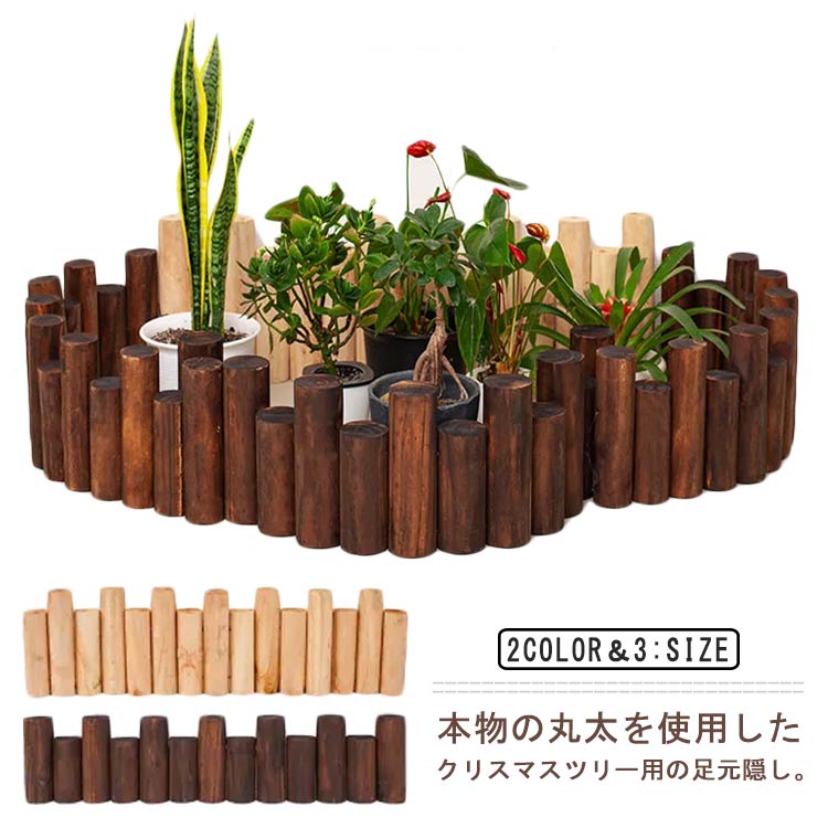 本物の丸太を使用したクリスマスツリー用の足元隠し。クリスマスツリーの足元にクリスマスツリーの寂しい足元をおしゃれに隠すことが出来ます。ツリーを飾らない時期にも、植木鉢の目隠しとして楽しめます。本物の丸太を使用しているので、足元からクリスマスツリーが綺麗に見えます。ウッドフェンスひとつで、簡単に北欧風ツリーの雰囲気が味わえます。小さいツリーから大きなツリーまで 角度を自由に変えられるので、さまざまなサイズのクリスマスツリーに対応。 サイズ 直径5cm×高さ15/20cm 直径6cm×高さ15/20cm サイズについての説明 長さ90cm 高さ約15/20cm 一本の直径5cm 18本セット長さ90cm 高さ約15/25cm 一本の直径6cm 15本セット※サイズ計測には誤差が生じます。 素材 木 色 ブラウン(長さ90cm) ベージュ(長さ90cm) 備考 ●サイズ詳細等の測り方はスタッフ間で統一、徹底はしておりますが、実寸は商品によって若干の誤差(1cm〜3cm )がある場合がございますので、予めご了承ください。 ●製造ロットにより、細部形状の違いや、同色でも色味に多少の誤差が生じます。 ●パッケージは改良のため予告なく仕様を変更する場合があります。 ▼商品の色は、撮影時の光や、お客様のモニターの色具合などにより、実際の商品と異なる場合がございます。あらかじめ、ご了承ください。 ▼生地の特性上、やや匂いが強く感じられるものもございます。数日のご使用や陰干しなどで気になる匂いはほとんど感じられなくなります。 ▼同じ商品でも生産時期により形やサイズ、カラーに多少の誤差が生じる場合もございます。 ▼他店舗でも在庫を共有して販売をしている為、受注後欠品となる場合もございます。予め、ご了承お願い申し上げます。 ▼出荷前に全て検品を行っておりますが、万が一商品に不具合があった場合は、お問い合わせフォームまたはメールよりご連絡頂けます様お願い申し上げます。速やかに対応致しますのでご安心ください。 メーカー希望小売価格はメーカーカタログに基づいて掲載しています