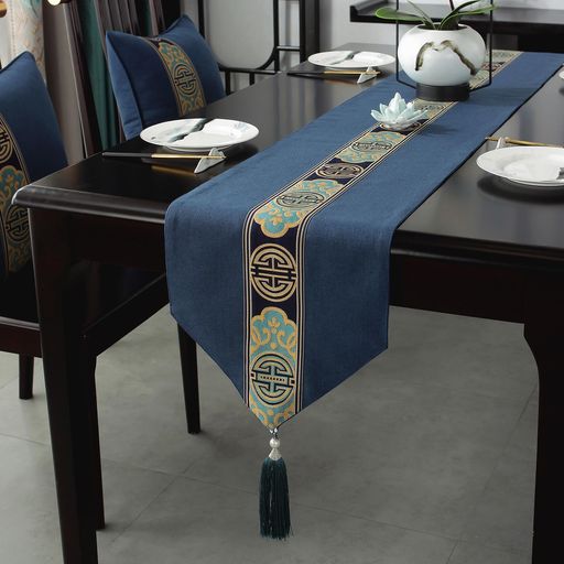 青未了テーブルランナー防水厚手如意模様テーブルセンタークロス両面使えるセンタークロステーブルらんなーtablerunnerテーブルセンター布タッセル付き160x33cm藍色
