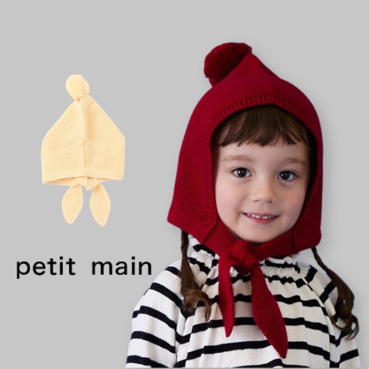 【半額】セール petit main【プティマイン】ボンネット風 ニット帽【人気 子供服 キッズ 小物 帽子 ニットキャップ 無地 梵天 かわいい 男の子 女の子 sale】9633433