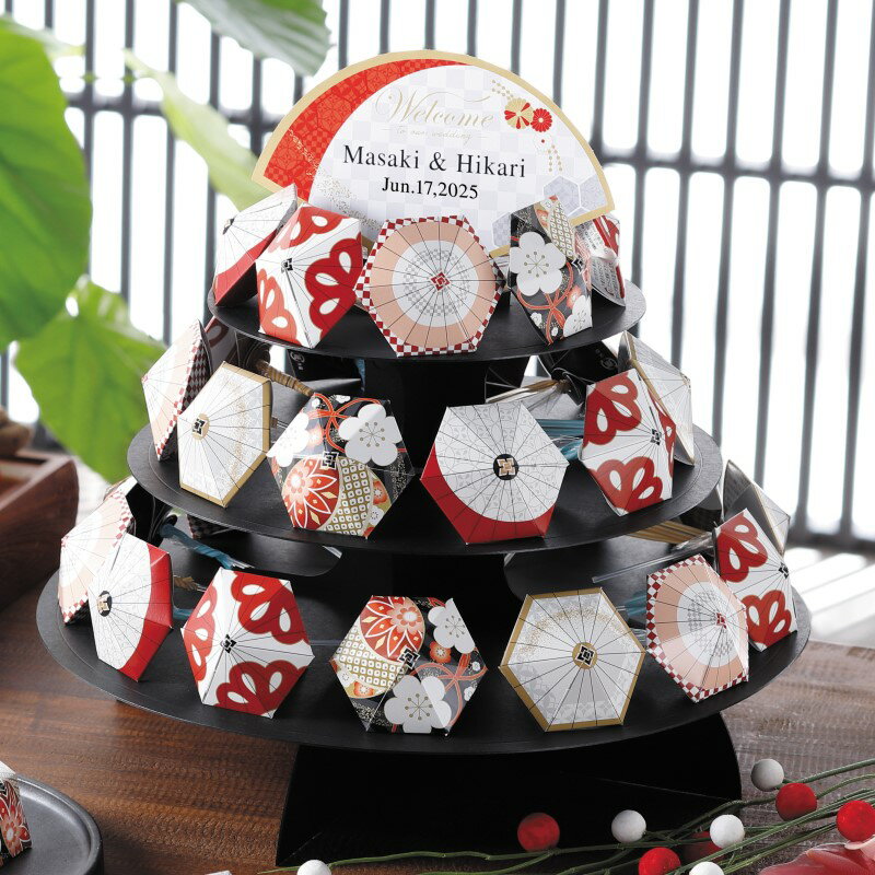 ●棒付きキャンディー1本入(レモン ・ グレープ)×32個 ●台付き ●カード付き・・・挙式日、お名前が英字で入ります。 但し、記号(ー・∧)を入れることはできません。 (不可例:Tar o・Yok o) ●全体サイズ/φ360×330mm ●単品サイズ/60×75×100mm ※種類の指定はできません。 ■ご注文の際の注意事項 納期受注後8日~(当店休業日含まず)※納品目安7日未満の場合、お問合せください。できる限りご希望に添えさせていただきます。 ※オーダー商品の為、原則受注後のキャンセルは出来ません。予めご了承ください。受注後の変更には別途料金がかかる場合がございます。 祝傘(棒付キャンディー)1個はこちらからご購入ください メーカー希望小売価格はメーカーカタログに基づいて掲載しています◆プチギフト一覧へ ◆和風プチギフト一覧へ 祝傘(棒付キャンディー)32個セット 中国より伝来され日本独自に進化した和傘 中国から輸入され伝来しましたが、当時は開閉できない天蓋(てんかい)と呼ばれるものでした。 その後、日本独自の技術により、室町時代には、現在と同じ用途で使用される和傘の形となりました。