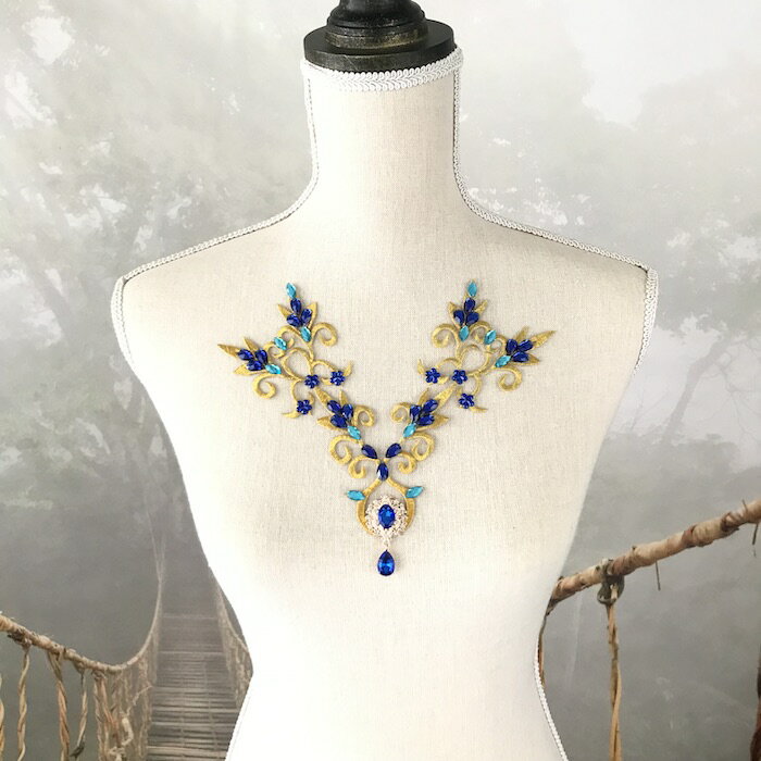 ゴールド モチーフ アイロン接着 レオタード ネックラインモチーフ バトンモチーフ ブルー ラインストーン ワッペン アイロン用 貼り付け アップリケ フィギュアスケート パーツ 衣装 レオタードモチーフ バレエ衣装