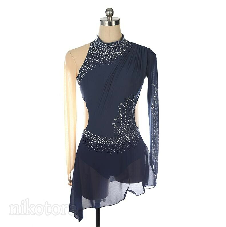 長袖 バイカラー フィギュアスケート衣装 女の子 コスチューム ウェア きれいめ 人気 上品 スケート ウェア アイスダンス 衣装 キラキラ ドレス レオタード スタンダード ダンスドレス ダンスウェア 子供 大人 レッスン着 ステージ衣装 舞台 試験 練習 着 競技 演出服 紺