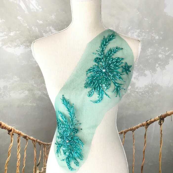 衣装モチーフ 新体操 レオタードモチーフ バトンモチーフ 装飾 チュールモチーフ ビーズ付き 花柄 衣装 ダンス衣装 舞台衣装 装飾レースモチーフ グリーン バレエ衣装 フィギュアスケート