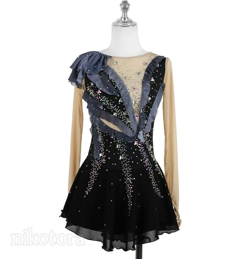 フィギュアスケート 衣装 女子 大人 アイスダンス 衣装 レオタード スタンダード スケート衣装 コスチューム フリル きれいめ エレガント 人気 上品 長袖 スケートウェア コスチューム 女の子 ダンス衣装 ドレス レッスン 練習 着 発表会 競技 演出服 ステージ衣装 黒グレー