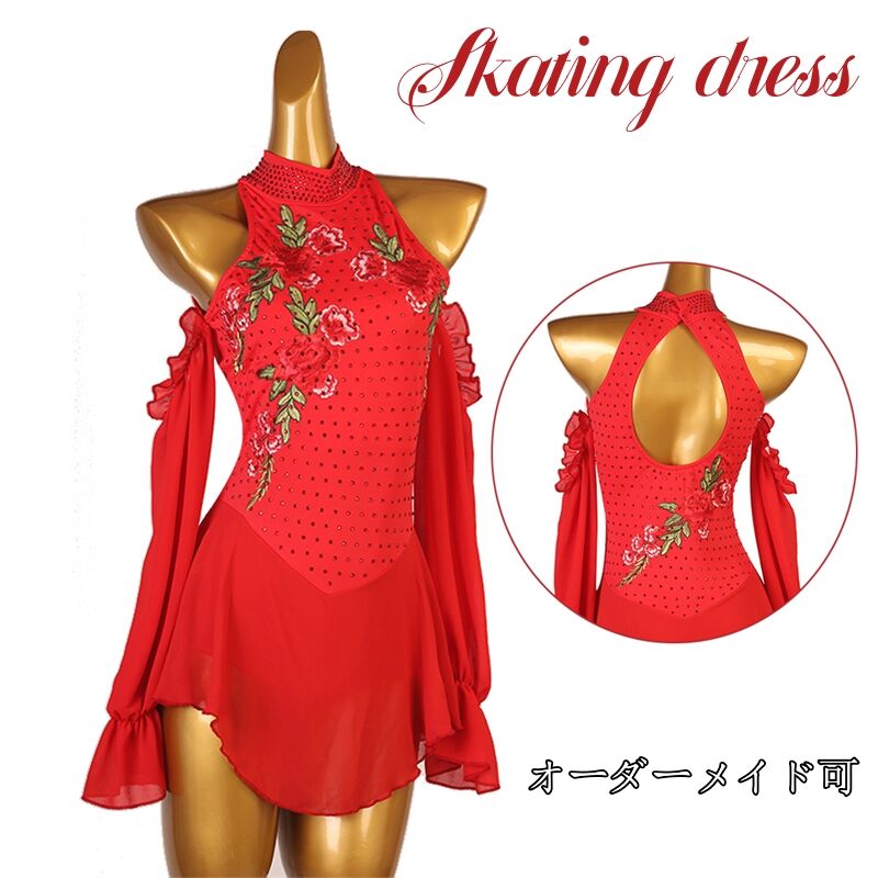 フィギュアスケート衣装 アイススケートウェア アイスダンス スケート衣装 専用レオタード レッスン着 衣装 ドレス ダンス衣装 ダンスドレス 練習 競技 ダンスウェア 肩が出し 長袖 お花飾り レッド ラインストーン 子供 大人 イベント 演出 スタンダード 競技着海外通販