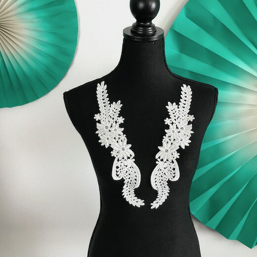 素敵なお花のレースモチーフセットになります。 新体操、社交ダンス、バトントワリング、 レオタード、フィギュアスケートの衣装、 バレエ、ドレスなどに縫い付けるだけで ワンポイントアクセントとして個性的な仕上がりになります。 サイズ:H31.5cm W6cm カラー:ホワイト ※左右セット