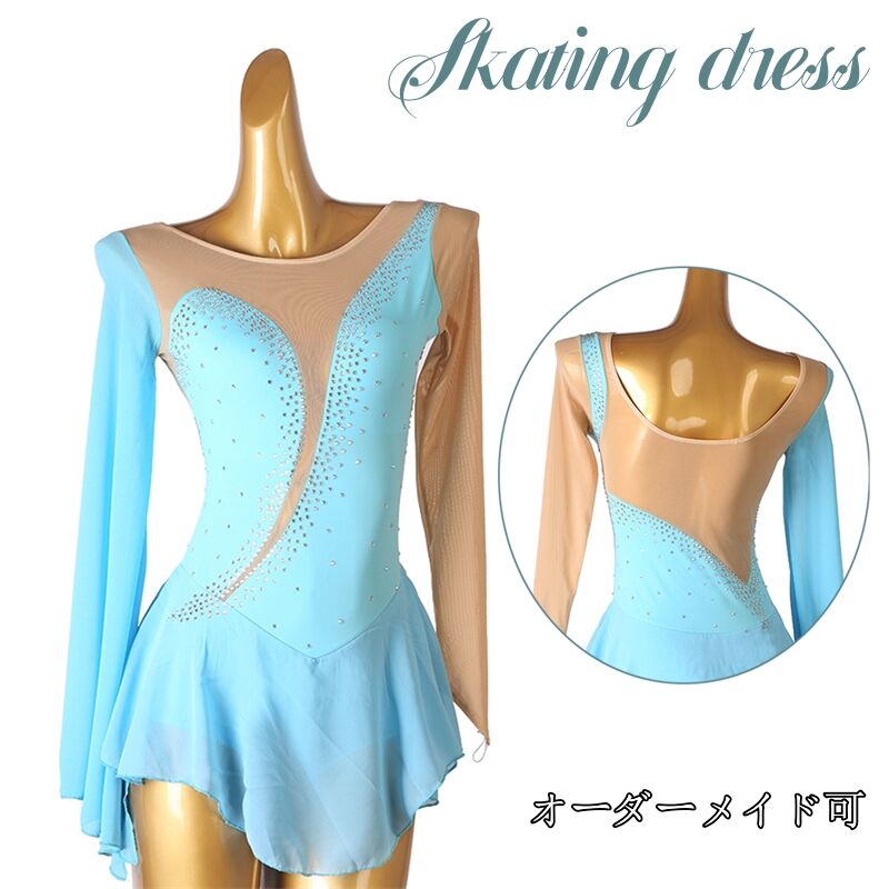 フィギュアスケート衣装 アイススケートウェア アイスダンス スケート衣装 専用レオタード レッスン着 衣装 ドレス ダンス衣装 ダンスドレス 練習 競技 ダンスウェア 水色 肌色 フリルの長袖 ラインストーン 子供 大人 イベント 演出 スタンダード 発表会 競技着海外通販