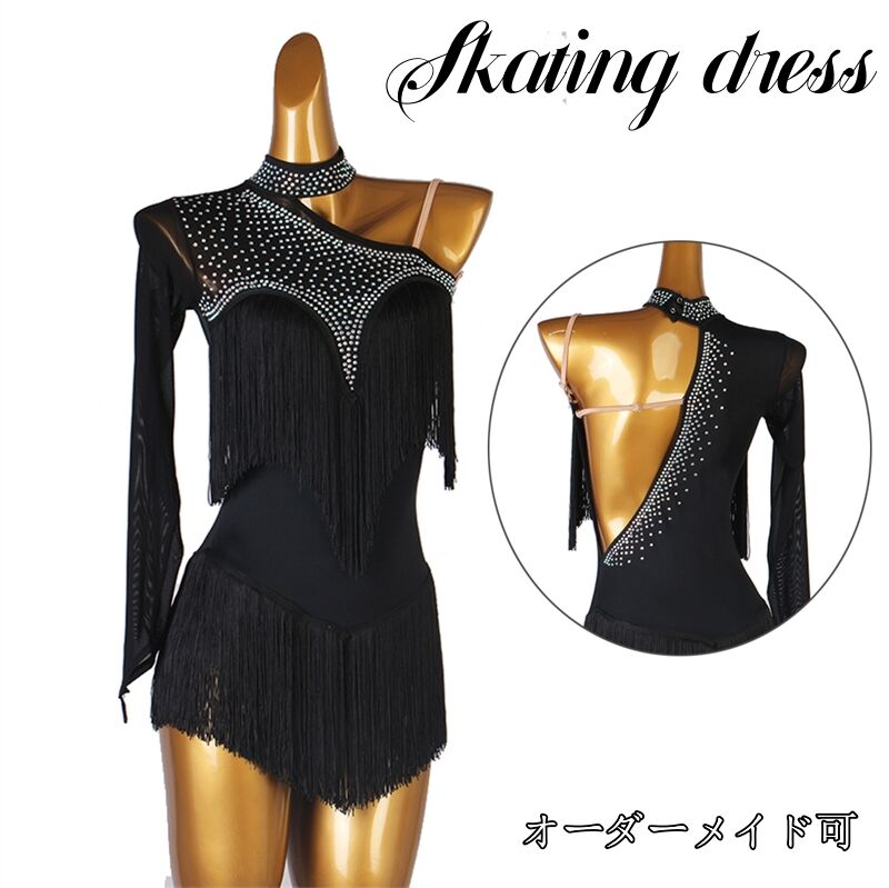 フィギュアスケート衣装 アイススケートウェア アイスダンス スケート衣装 専用レオタード レッスン着 衣装 ドレス ダンス衣装 ダンスドレス 練習 競技 ダンスウェア 単袖 フリンジ裾 ブラック ラインストーン 子供 大人 イベント 演出用 スタンダード 競技着海外通販