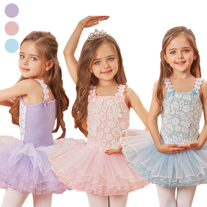 バレエ レオタード レース リボン レオタードスカート 子供 おしゃれ スカート付 フリル コットン 綿 ストレッチ 伸縮 練習 レッスン 新体操 バレエ用品 ピンク パープル ブルー 105 110 120 130 140 150 送料無料