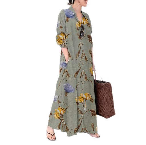 [JINJUDUO]コットンルーズロングシャツドレス長袖大きいサイズ薄手無地プリントロングドレス(グリーンプリント3XL)