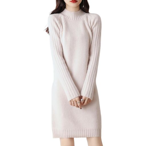 [JINJUDUO]ニットワンピース秋冬レディースセーターカシミヤ調長袖ミディアム丈ゆったり厚手伸縮性ハイネックスリムフィット着痩せ効果シンプルデザインカジュアル・オフィスベージュ