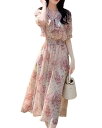 【送料無料】[Collecala] 夏服 レディース Vネック花柄ウエスト絞りふんわりロングワンピース 大人ガーリーチュニックワンピース サマーシフォン 裏地付き 涼しいdressaラインワンピース 色:オフ/ピンク、サイズ:XL Regular