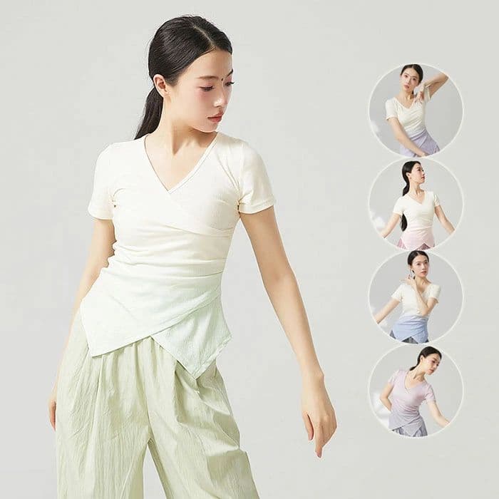 ダンストップス Vネック クロス 半袖 グラデーション ダンス衣装 全5色 Tシャツ ダンスレッスン着 トップス 古典ダンス衣装 大人用 モダンダンス 社交ダンス 競技着 フィットネス 上着 トレーニング スポーツ ストレッチ ヨガ レッスン 練習着 着痩せ おしゃれ S M L XL