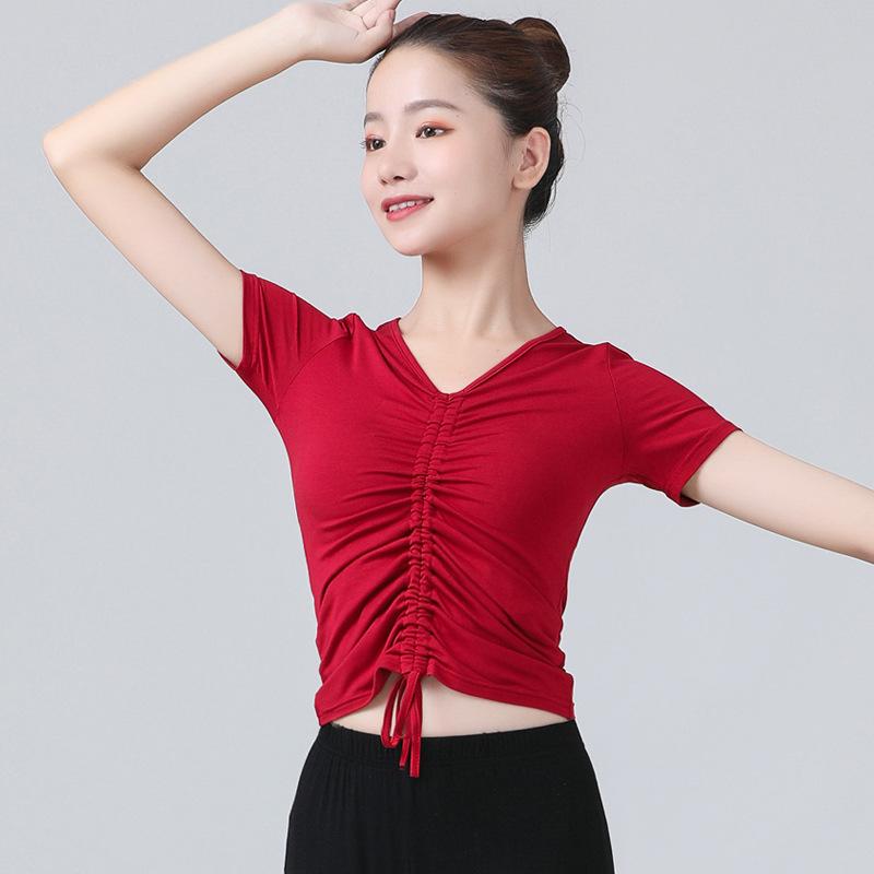 ダンス トップス レディース 女性用 夏 モダール 半袖 ドローストリング フィットネス ヨガ トレーニング ラテンダンス 練習着 スポーツウェア 吸湿速乾 快適 黒 ワインレッド