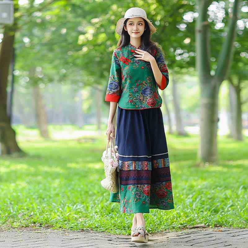 セットアップ レディース おしゃれ 上下 春秋 ヴィンテージ風 民族風 綿麻 花柄 トップス スカート 写真撮影 舞踊衣装