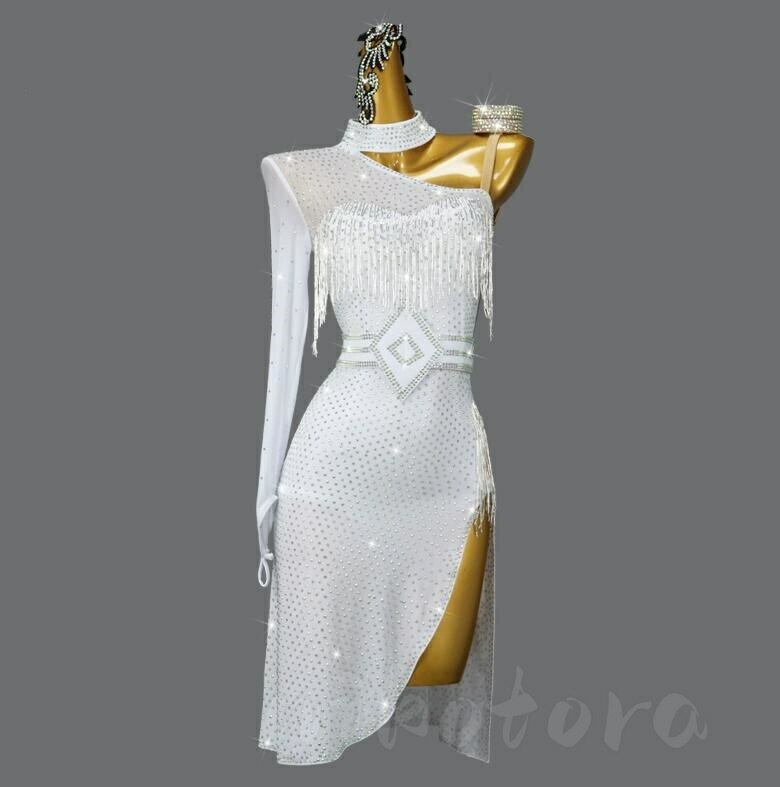 肩出し ワンピース モダンドレス ラテンドレス スタンダードドレス ワルツダンス 社交ダンス衣装 ドレス 初心者 練習着 競技着 ショート丈ワンピース タッセル付き 長袖 ダンスウェア デモ用 ラテンドレス レッスン着 演出 舞台衣装 ダンス発表会 団体