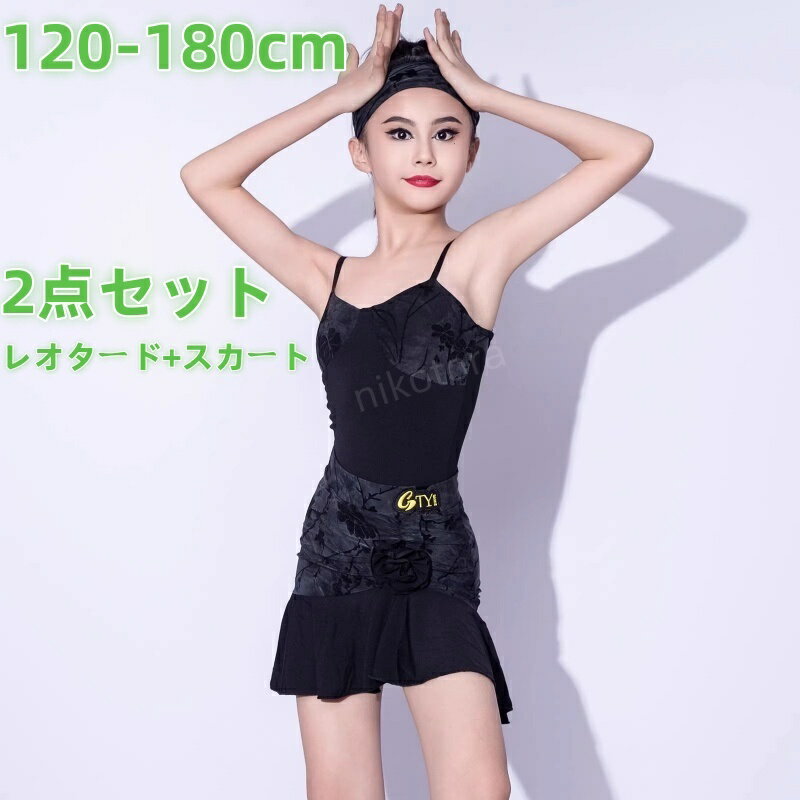 【送料無料】ラテンダンス衣装 子供 ブラック プリント ノースリーブ キャミレオタード スカート付き 上下2点セット 女の子 ジュニア ダンスウェア ラテン チャチャチャ タンゴ ワルツ ステッジ衣装 舞台 発表会 演奏会 練習 競技 イベント パーティー ラテンドレス