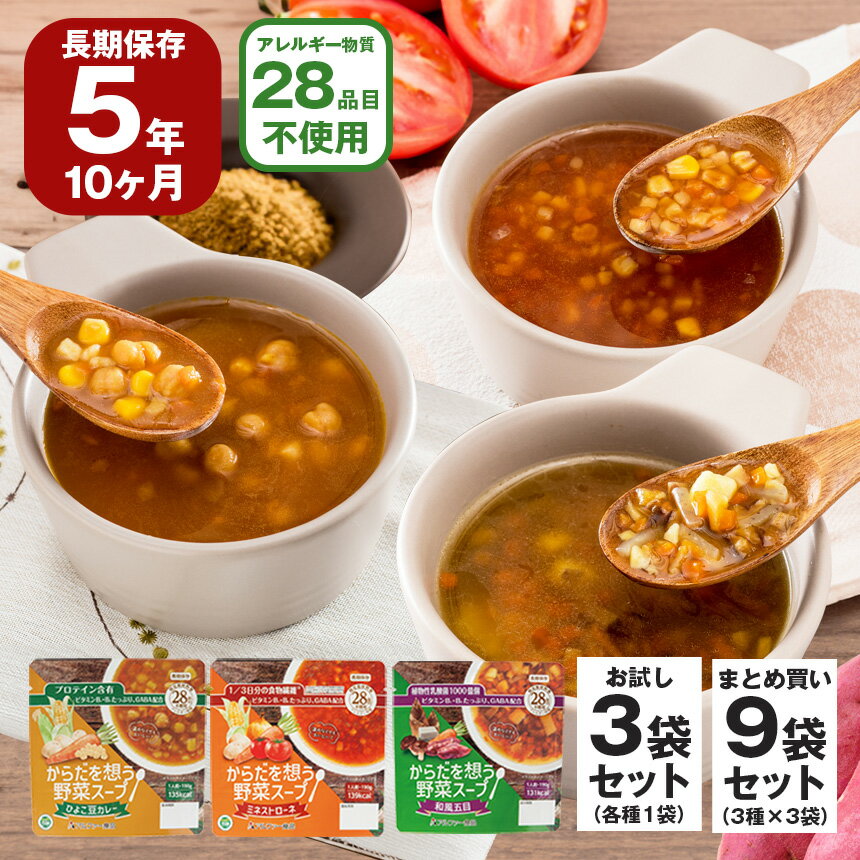 からだを想う野菜スープ【3種セット/9袋セット(3種×3袋)】 野菜スープ 3種 190g ミネストローネ ひよこ豆カレー 和風五目 長期保存 加熱不要 調理不要 断水 防災 非常時 病気 ケガ アレルギー対応 ローリングストック ヴィーガン【送料無料】