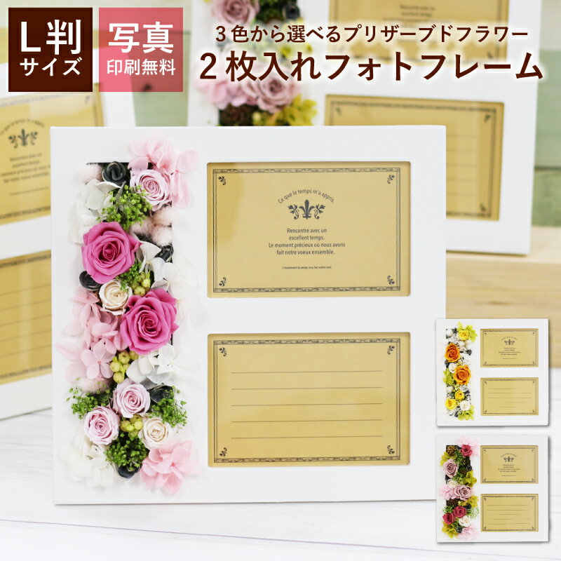 プレゼント プリザーブドフラワー 枯れない 花 バラ 写真入れ 複数 フォトフレーム 写真立て ウッド 木製 ギフト 贈り物 結婚祝い 退職 誕生日 送別 還暦 祝電 お祝い 結婚記念日 母 義母 祖母 父 義父 祖父 孫 60代 70代 アレンジメント 縦 横 L判 2枚 写真 印刷 プリント