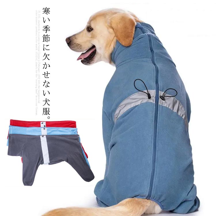 寒い季節に欠かせない犬服。もこもこフリース素材で暖かくて寒さを防ぐ、保温性に優れます。長袖タイプで、ワンちゃんをすっぽりやさしく包んで暖かい。足を通してファスナーで留めるだけなので着させ易い作りです。反射テープ付きが付いて、雨の日に人間の目線では気づきにくいワンちゃんの身を守る。寒い季節のお散歩やお出かけにぴったりな一枚です。大型犬・中型犬に向ける6サイズを展開! サイズ26 28 30 32 34 36サイズについての説明26 バスト66cm 背中の長さ42cm 首周り41-44cm 体重7.5-11kg 28 バスト72cm 背中の長さ47cm 首周り44-48cm 体重11.5-15kg 30 バスト78cm 背中の長さ52cm 首周り47-52cm 体重15-21kg 32 バスト84cm 背中の長さ57cm 首周り50-53cm 体重21-27.5kg 34 バスト91cm 背中の長さ62cm 首周り53-58cm 体重30-38kg 36 バスト99cm 背中の長さ67cm 首周り58-64cm 体重38-45kg素材ポリエステル色レッド ブルー ダークグレー備考 ●サイズ詳細等の測り方はスタッフ間で統一、徹底はしておりますが、実寸は商品によって若干の誤差(1cm〜3cm )がある場合がございますので、予めご了承ください。 ●商品の色は、撮影時の光や、お客様のモニターの色具合などにより、実際の商品と異なる場合がございます。あらかじめ、ご了承ください。●製品によっては、生地の特性上、洗濯時に縮む場合がございますので洗濯時はご注意下さいませ。▼色味の強い製品によっては他の衣類などに色移りする場合もございますので、速やかに(脱水、乾燥等)するようにお願いいたします。 ▼生地によっては摩擦や汗、雨などで濡れた時は、他の製品に移染する恐れがございますので、着用の際はご注意下さい。▼生地の特性上、やや匂いが強く感じられるものもございます。数日のご使用や陰干しなどで気になる匂いはほとんど感じられなくなります。