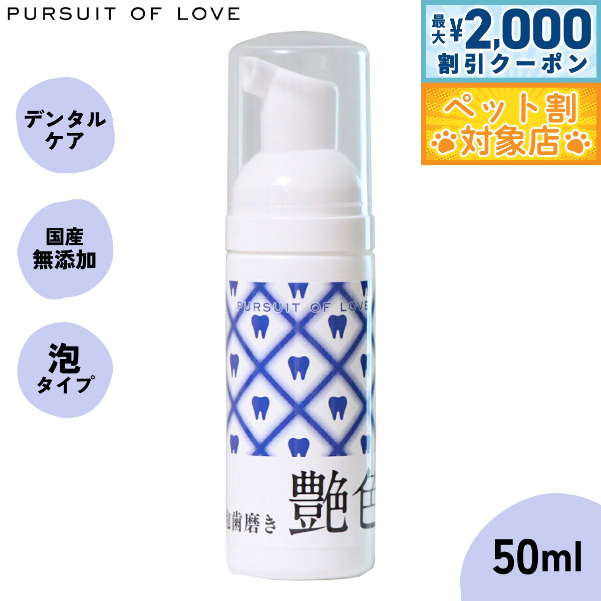 【最大2000円OFFクーポン!&店内ポイント最大62倍!スーパーSALE!】【レビュー特典あり】パシュートオブラブ PURSUIT OF LOVE 艶色〜泡歯磨き〜 50ml 犬 デンタルケア 歯磨き ハミガキ 歯周対策 歯石ケア 無添加 国産 4573106000763