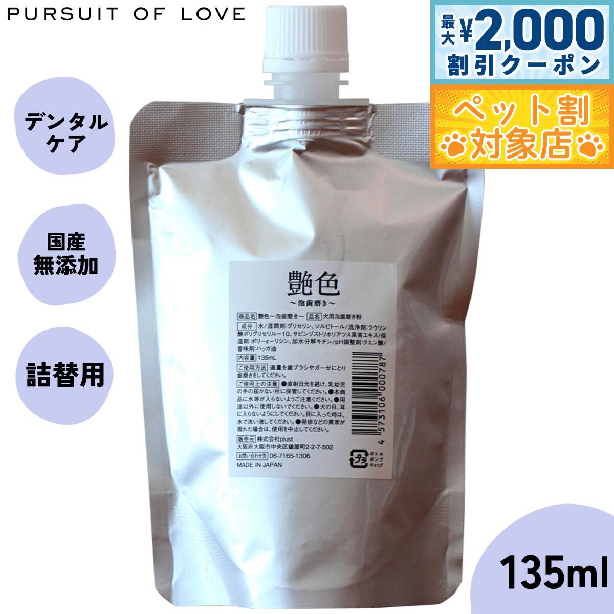 【最大2000円OFFクーポン!&店内ポイント最大62倍!スーパーSALE!】【レビュー特典あり】パシュートオブラブ PURSUIT OF LOVE 艶色〜泡歯磨き〜 詰め替え用 135ml(約3回分) 犬 デンタルケア 歯磨き ハミガキ 歯周対策 歯石ケア 無添加 国産