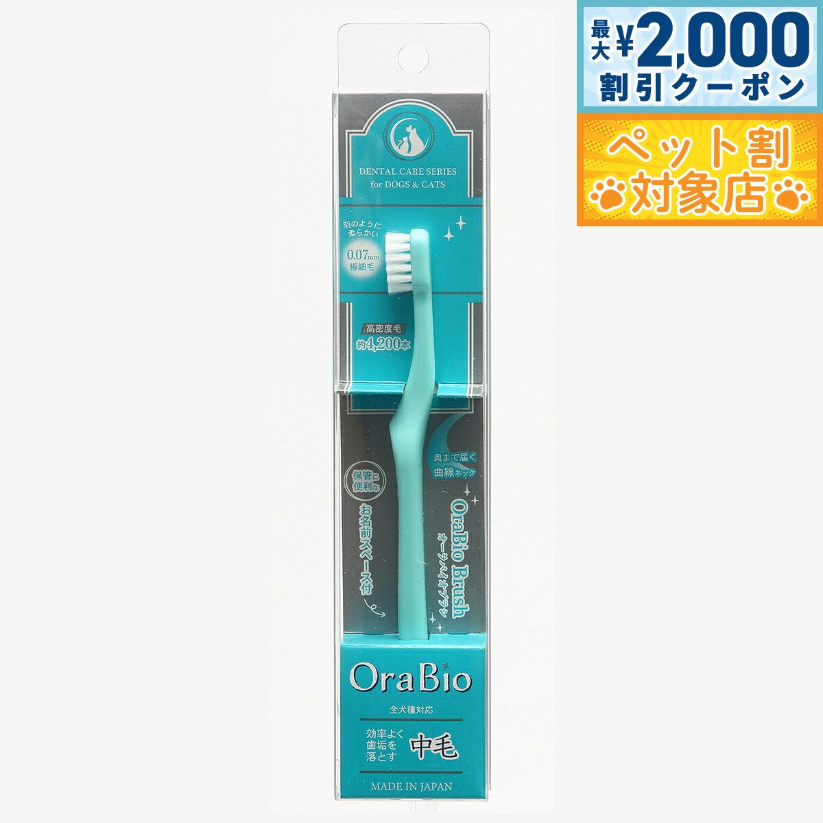 歯磨きの専門家である犬の歯のスペシャリスト(元・人間の歯科衛生士)と、歯ブラシの専門家である歯ブラシマイスター(歯ブラシ一筋約20年)が、共同開発したのがこの歯ブラシです。一般的な子供用歯ブラシの5倍以上、約4200本の毛を備え、”羽”のように柔らかい0.07mm毛が密集しているので、毎日の歯磨きが苦にならないペットのお口に優しい歯ブラシです。独特の曲線ネックにより、口角を無理に引っ張らなくても、歯石が溜まりやすい奥歯までブラシが届きます。ありそうで無かった「お名前」スペースも配置。毛先の長さ、短毛:5.5mmお口の小さな子、お口を開けてくれない子、ねこちゃんに商品名OraBio オーラバイオブラシ 短毛ブランドOrabio オーラバイオ材質柄:PP樹脂、毛:ナイロン生産国日本 対象ペット:犬、猫★短毛タイプ:お口の小さな子、お口を開けてくれない子、ねこちゃんに凹凸があるペットの歯にもピッタリ密着して磨けるため、無理なく歯磨きが続けられます。また、お口の奥の狭い所にピンポイントで歯ブラシを当てたい時にも役立ちます。[歯磨きのPOINT]毛先を優しく小刻みにゆらすようにして、少しずつ歯を磨いていきます。歯磨きの後はご褒美を与えながら「歯磨き=楽しいこと」だと結びつけ、無理をせずブラッシングを行ってください。[使用上の注意]● 歯ブラシを噛ませないでください。● 歯ブラシを噛むと毛が抜ける恐れがありますので、遊ばせないようご注意下さい。● 本品をご使用になり、出血などが続く場合は、獣医師にご相談ください。● 使用後は、流水で汚れをよく洗い落とし、充分に水をお切りください。● 歯ブラシの保管は、風通しのよい乾きやすい所に置いてください。[交換時期について]使用とともに毛の弾力性が落ち清掃効果も低下してきますので、1〜2ヶ月を目安に交換してください。メーカー名株式会社BYRONOraBio オーラバイオブラシ 短毛歯磨きの専門家である犬の歯のスペシャリスト(元・人間の歯科衛生士)と、歯ブラシの専門家である歯ブラシマイスター(歯ブラシ一筋約20年)が、共同開発したのがこの歯ブラシです。一般的な子供用歯ブラシの5倍以上、約4200本の毛を備え、”羽”のように柔らかい0.07mm毛が密集しているので、毎日の歯磨きが苦にならないペットのお口に優しい歯ブラシです。独特の曲線ネックにより、口角を無理に引っ張らなくても、歯石が溜まりやすい奥歯までブラシが届きます。ありそうで無かった「お名前」スペースも配置。毛先の長さ、短毛:5.5mmお口の小さな子、お口を開けてくれない子、ねこちゃんに
