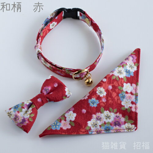猫 首輪 リボン バンダナ ハゲない コットン セーフティバックル 安全ベルトの3点セット。 和柄 鈴 蝶ネクタイ 【猫雑貨招福】