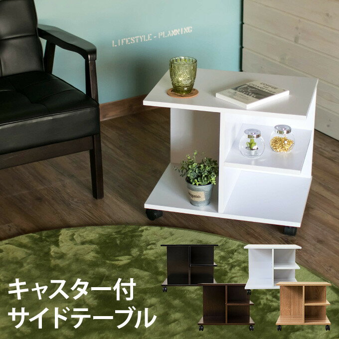 小回りの利くサイドテーブル(キャスター付き) 見た目はシンプルで、ソファサイドだけでなくデスク下や部屋の壁際にぴったり付けて設置できるサイドテーブルです。 天板サイズは約50x35cmで小物を手元にまとめられる広めのスペースになっています。 高さは約42.5cmで座椅子とも合わせやすい低めの作りです。 天板下には自由に使えるスペースが3か所。 小物を飾り付けてディスプレイしたり、雑誌類などの収納にも活用できます。 キャスター付きで、移動がスムーズにできます。 内2個にはストッパーが付いているので、動かないように固定できます。 ※こちらは訳あり商品となります。 若干の傷・汚れ等ご使用に支障が無い程度のものはご容赦下さいますようお願い致します。 ご使用に差し支える傷等は交換致しますのでご連絡お願い致します。 ブラック、ナチュラル、ウォールナット、ホワイトの4色をご用意しております 商品名キャスター付き サイドテーブル サイズ(W)幅54(キャスターを含む)×(D)奥行38.5(キャスターを含む)×(H)高さ42.5cm 天板・棚板の厚み:約1.5cm 天板耐荷重:約10kg(端の方に偏って荷重をかけないようお願いします) 棚板耐荷重:約2kg 本体重量:8.4kg 材質合成樹脂化粧繊維板 キャスター4個(内2個ストッパー付) 備考 低価格での商品提供の為、海外工場にての生産、検品になります。 国内検品基準とは多少異なる場合もございます。 送料送料無料北海道・沖縄・離島を含む(一部配送不可地域)のご注文は配達不可のためキャンセルさせて頂きます。 サイドデスク サイド机 簡易デスク 在宅ワーク テレビボード AVラック リビング収納 ブラック ナチュラル ウォールナット ホワイト 茶色 白色 黒色