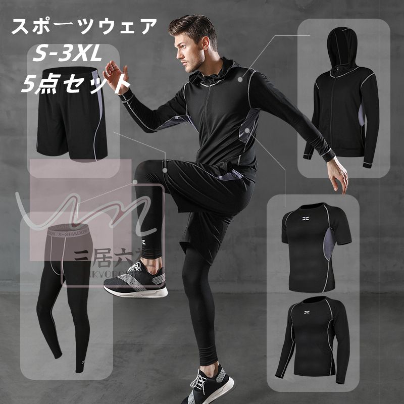 スポーツウェア メンズ5点セット コンプレッションウェア パーカー メンズ 上下セット スポーツウェア メンズ セット トレーニングウェア ランニングウェア ジムウェア 長袖 半袖 ハーフパンツ タイツ 吸汗速乾