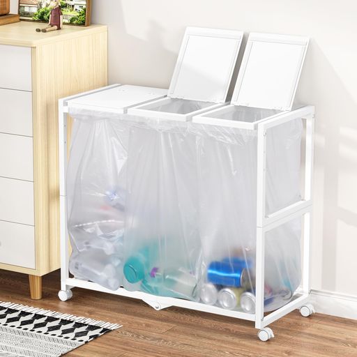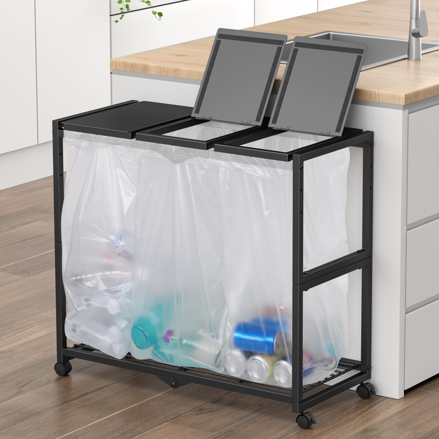 ・?【1台で3分別できるゴミ箱】中身が見える3分別ゴミ袋ホルダーですので、瓶・缶・ペットボトル・プラスチックなどの資源ごみを分別することにぴったりする上、ゴミの量が一目でわかり、捨てるタイミングも計りやすくなります。何個のゴミ箱を置く必要がなく、1台でゴミを簡単に分別しながら捨てることかできます。?商品仕様:キャスタータイプ組立後サイズ:約70*32.5*65cm アジャスタータイプ組立後サイズ:約70*32.5*61.5cm・?【20L?55L袋対応】ポリ袋やレジ袋のサイズに合わせて、折畳み可パイプの位置が約5cm間隔で調整可能のダストボックスです。折畳み可パイプの高さの調整だけで10L、20L、30L、45L、55L袋に幅広く対応しております。容量が決められた普通のキッチン ゴミ箱と違って、ゴミ袋の大きさに合わせてゴミをよりいっぱい入れることができており、合計最大165Lの大容量でゴミ捨ての日までに何度も袋を替える必要がない上、一人暮らし 便利グッズとしてはもちろん、家庭用分別ゴミ箱として最適です。・?【ゴミ袋の設置などが簡単】ゴミ袋を上部フレームに引っかけて簡単にゴミ袋 スタンドとして使用できる上、蓋を取り外して、ゴミ袋の回収・交換も容易にできます。また、底部はメッンュフレームで、替えのゴミ袋を保管することで、袋交換がよりスム一ズに行えて便利です。・?【キャスター&アジャスター付き】ご使用により、キャスター/アジャスターを選択して組み立て利用できるキャスター付きゴミ箱です。キャスターを選択する場合、サッと移動しやすくて使い勝手がよく、普段の掃除も簡単にできます。またストッパーつきキャスターですので固定もできて便利です。?アジャスターを選択する場合、すこし凹凸のある地面でもバランスを保ち、安定性は高い3分別ごみ箱です。・?【様々なシーンに大活躍&組立簡単】シンプルなデザインで、インテリアに馴染みやすくて、様々なキッチンシーンにマッチする上、リビング、洗面所、オフィスなどあらゆる場所で大活躍しており、カウンター下にもすっきり収まるので、インテリアに自然と溶け込みます。また、開口部は広くてゴミも捨てやすいゴミ箱ホルダーです。?日本語の取扱説明書も付いており、説明書の手順によって、6ステップで迷いなく簡単組立可能です。・?【こだわりの設計】フタは指をかけやすい設計で片手でサッと開閉できるであるゴミ袋スタンド上、蓋には固定用テープと騒音防止用テープも付いており、ゴミ袋はよりしっかり国定でき、滑り落ちることを心配する必要がなくて、ゴミの匂いもしっかり閉じ込め、空気を綺麗にして、蓋の閉める音も小さくなり、より楽に使用可能な分別塵箱です。?また、ケガや事故を防ぐ面取りも付いており、安心してお使い頂けます。