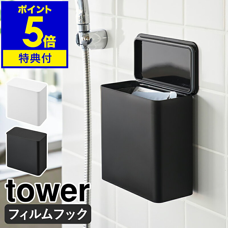 【特典付き】[ フィルムフック 密閉ゴミ箱 タワー ]山崎実業 tower ふた付き 浮かせて設置 壁面 シンク扉 トイレ 洗面所 ランドリールーム 洗濯機横 キッチン ダストボックス ごみ箱 生ごみ パッキン 北欧 おしゃれ yamazaki 公式 モノトーン ブラック ホワイト 1520 1521